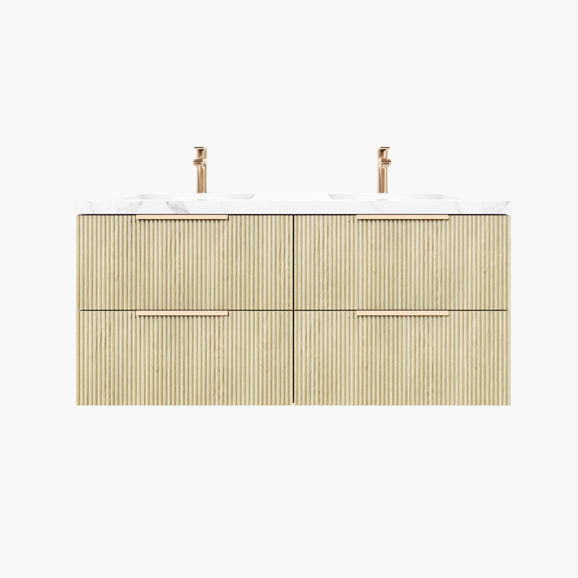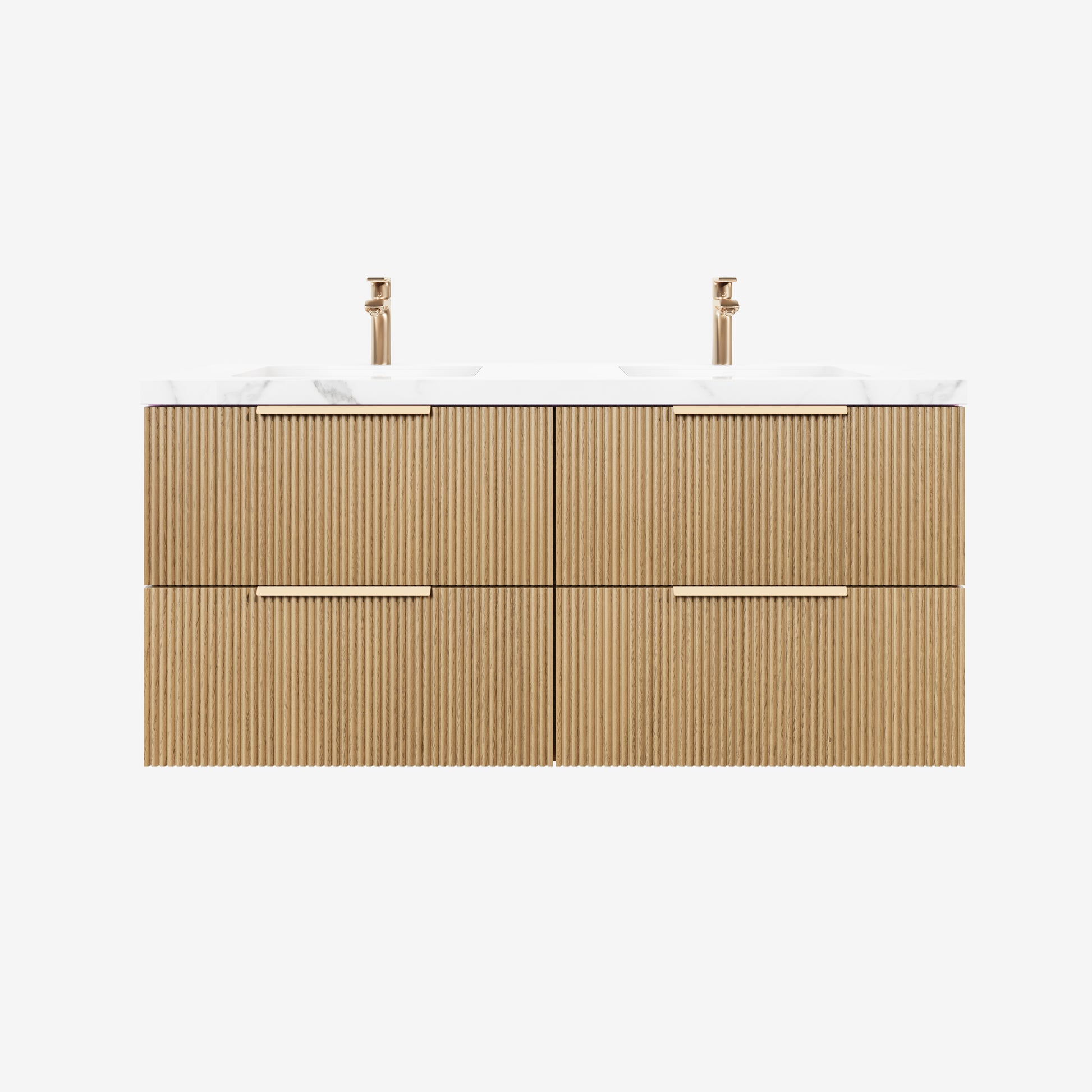 This modern wall-hung vanity features a stylish fluted design that saves floor space and keeps your bathroom looking clean.