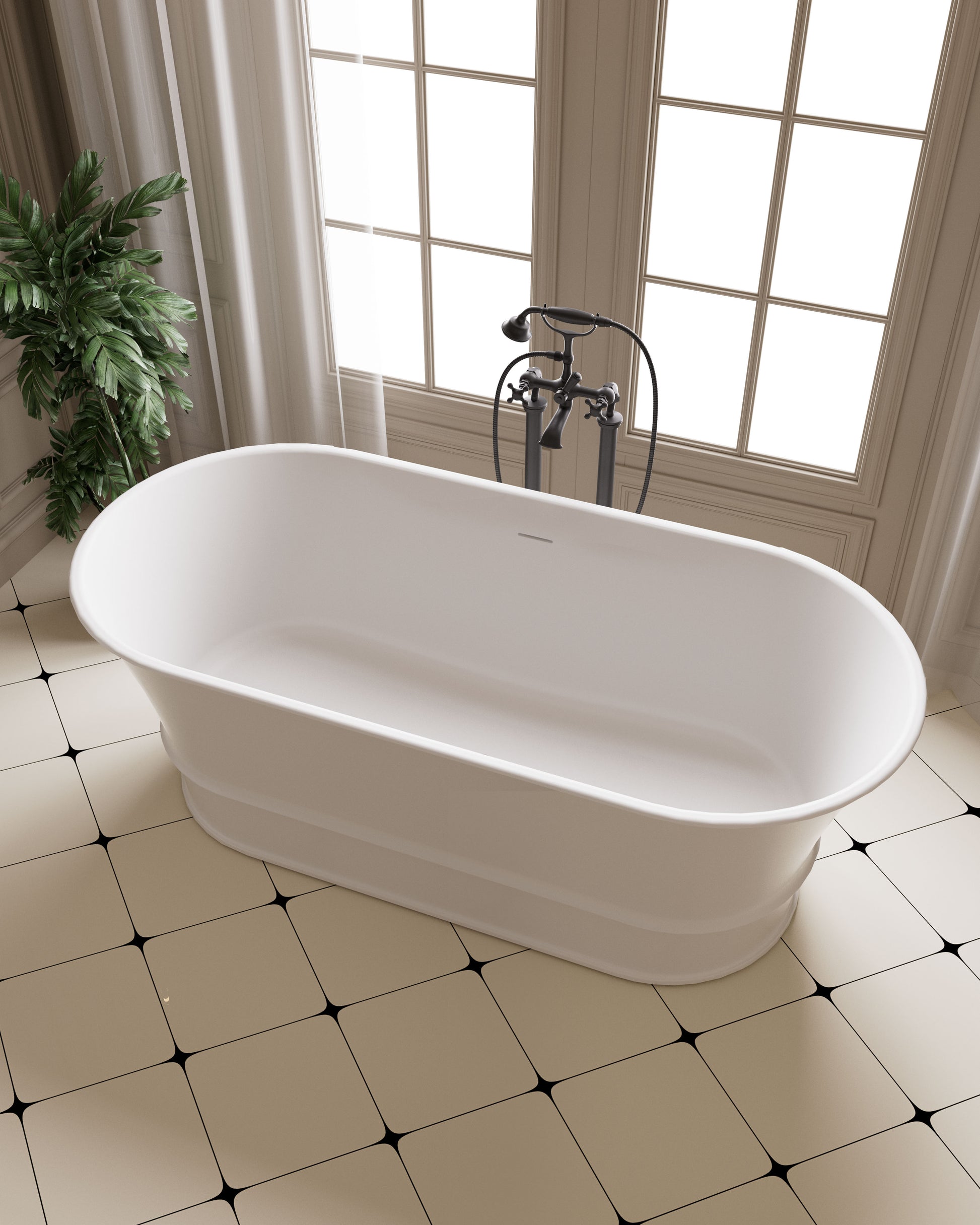 The Harrington is an oval-shaped solid surface freestanding bathtub with slim, graceful edges inspired by classic French design. Made from durable solid surface stone, it features a smooth finish, excellent heat retention, and timeless elegance, perfect for traditional bathrooms.