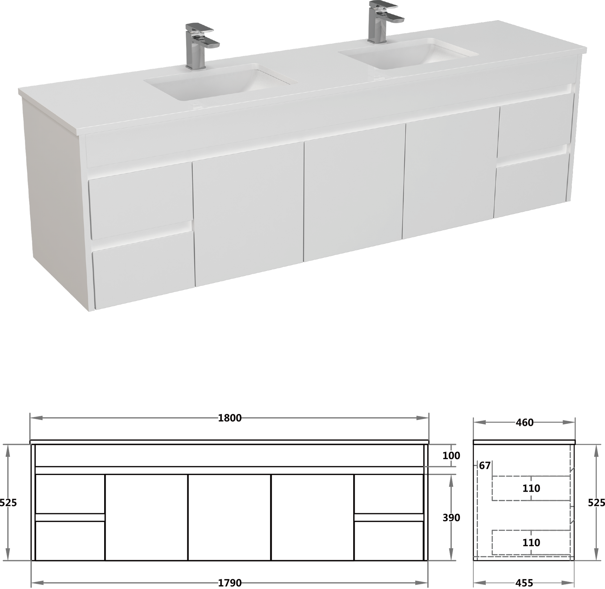 1800*460*545mm Wall Hung White Polyurethane PVC Vanity Double Bowls Polar P184WH